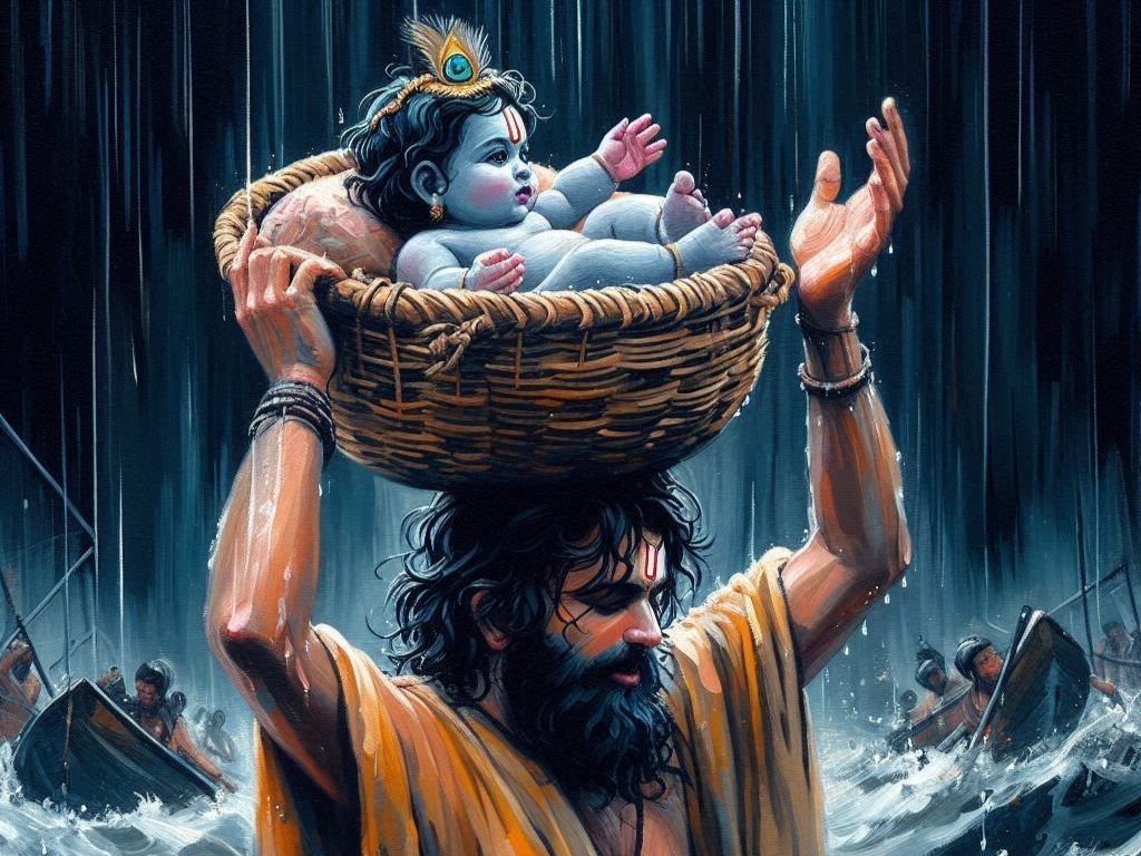 As Vasudev carried baby Krishna, the raging Yamuna parted her waters, allowing safe passage. Even nature bowed before the Supreme Lord. The stormy winds grew calm, and the thunder softened as Vasudev walked ahead. Lotus flowers bloomed on the river, and the waters shimmered with divine light. Sheshnag spread his hood above the child, shielding Krishna from the rain. In that sacred moment, the entire universe seemed to protect the Lord. The stars above glowed brighter, as if witnessing the divine play with reverence and joy. Guided by destiny and divine will, Vasudev moved forward, carrying not just a child, but the hope and protection of all creation.