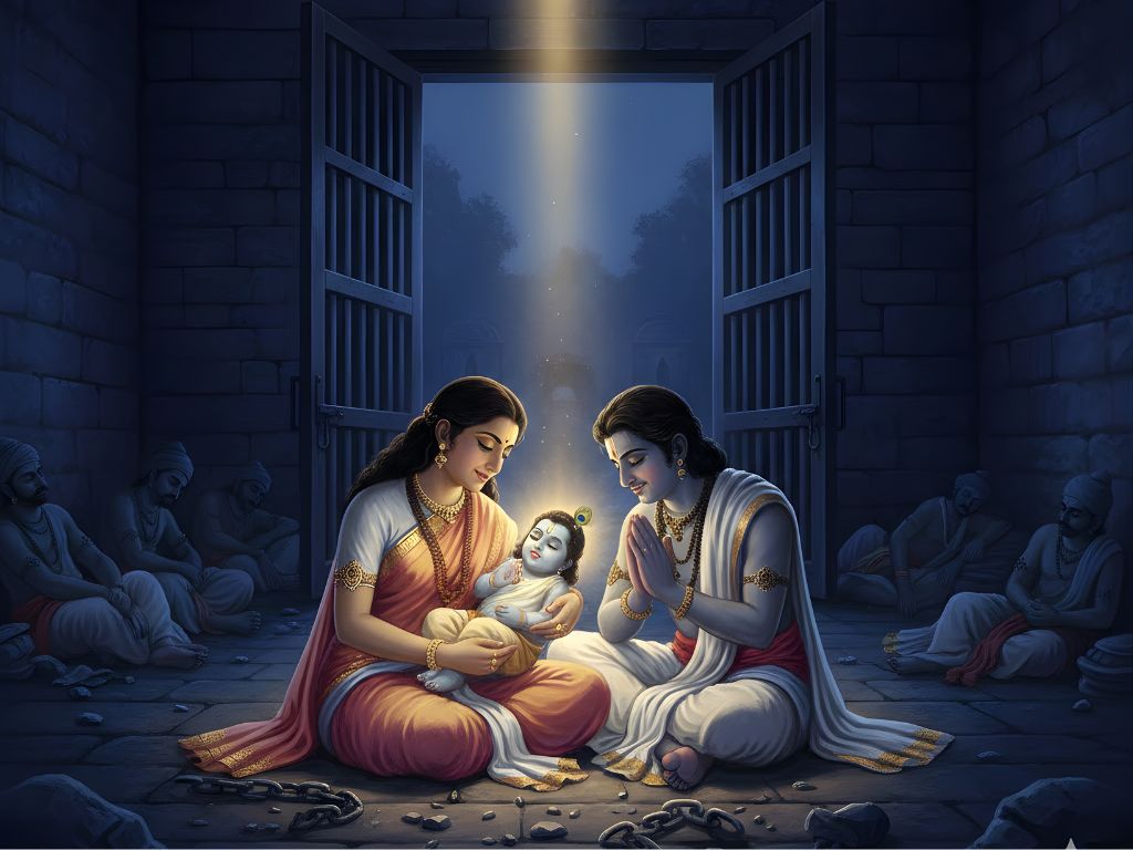 On the sacred night of Janmashtami, Lord Krishna appeared in the prison of Mathura to Devaki and Vasudev. Divine light filled the cell, chains broke, and guards fell into deep sleep. Carrying newborn Krishna across the stormy Yamuna, Vasudev reached Gokul, where Krishna was lovingly raised by Yashoda and Nanda Baba. A soft divine glow spread through the prison, filling the hearts of Devaki and Vasudev with peace. At that sacred moment, it felt as if all sorrow had ended and hope was born with the child.